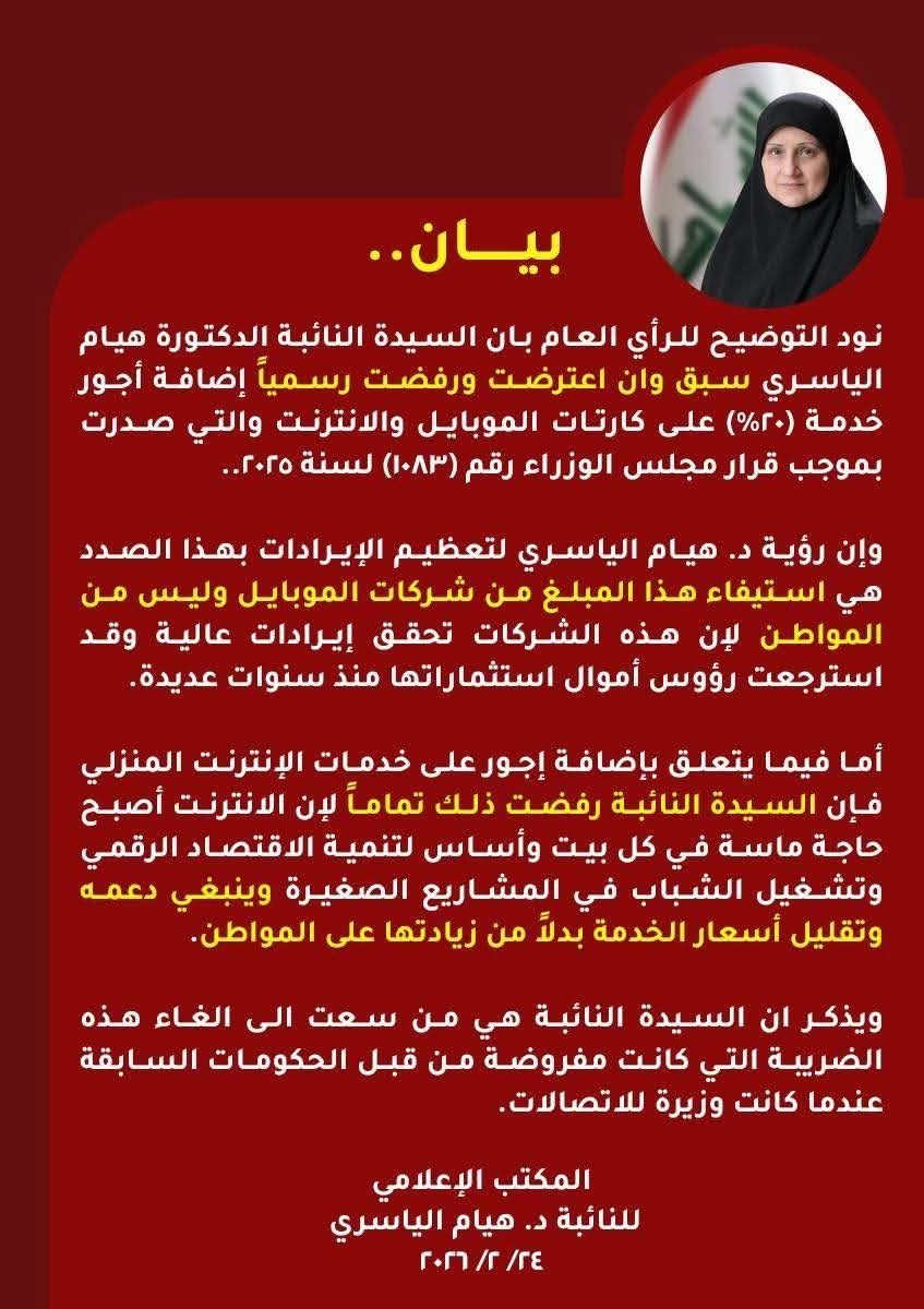هيام الياسري رفضت عندما كانت وزيرة اتصالات اضافة 20% على الكارتات والانترنت » وكالة بغداد اليوم الاخبارية