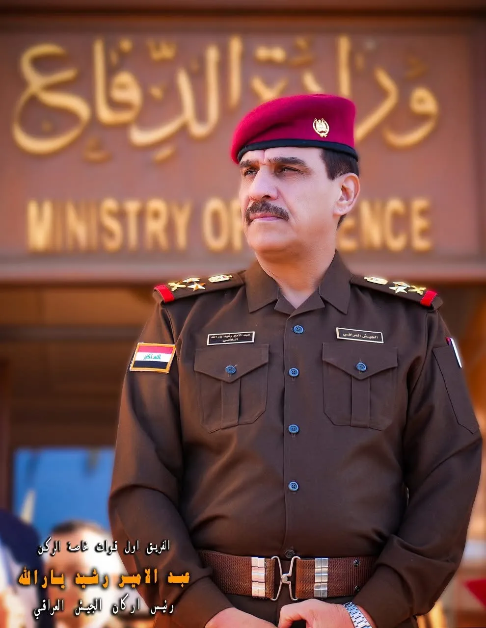 ومع اخوتي في وزارة الدفاع ورئاسة اركان الجيش وكافة المؤسسات الأمنية لتعزيز قدرات الجيش العراقي وتطوير منظومته العسكرية والقتالية ليبقى كما عهده العراقيون الحصن المنيع لدرء الأخطار عن أرض الوطن والدرع الرادع لحماية الشعب بكافة أطيافه والحارس الأمين للمؤسسات الدستورية والسيادة الوطنية”.